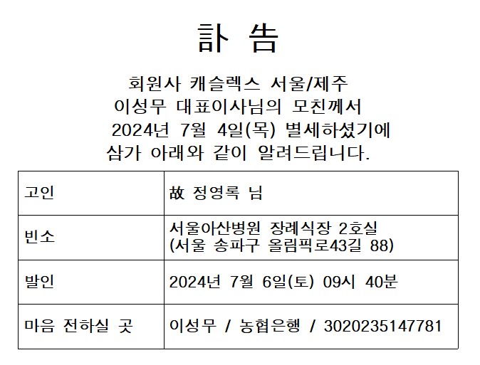 [부고] 캐슬렉스 서울/제주 이성무 대표이사 모친상