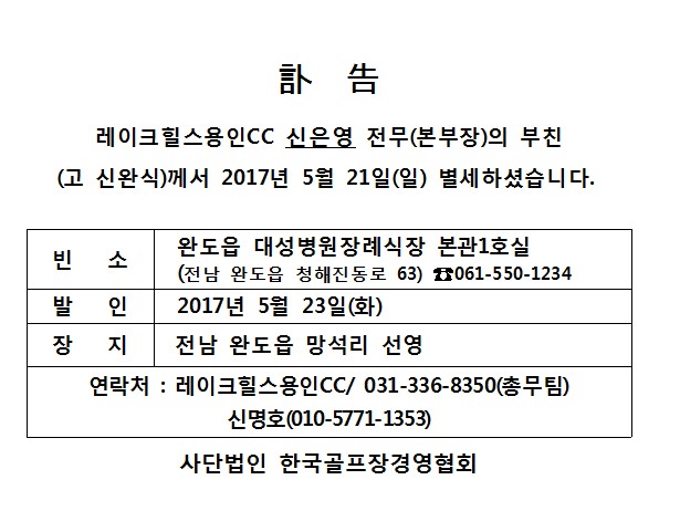 【부고】레이크힐스용인CC 신은영 전무 부친상(′17.5.21일-일)
